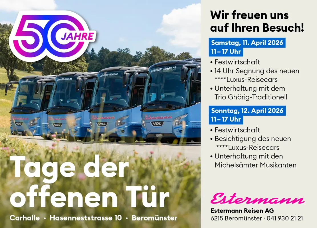 Seit 50 Jahren bietet Estermann Reisen aus Beromünster massgeschneiderte Reiseerlebnisse für Private, Gruppen, Vereine und Firmen. Ob Tagesausflug, Mehrtagesreise oder ein komfortabler Kleinbus-Service – wir planen Ihre Reise ganz nach Ihren Wünschen, damit Sie die schönsten Tage im Jahr entspannt geniessen können.